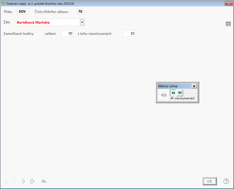 Pozor: zápis v desktopu se liší od webového zápisu v tom, že v desktopu zapisujeme počet celkem a z toho neomluvených, na webu počet omluvených a neomluvených hodin.