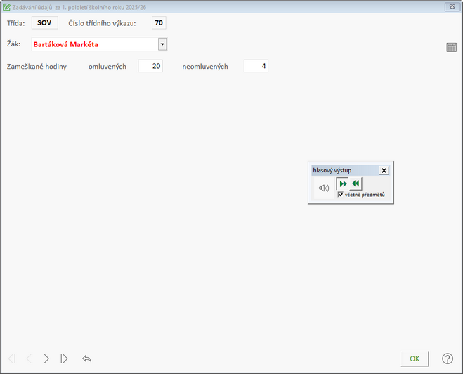 Zameškané hodiny je možné zadat i v desktopu, v nabídce v modulu Evidence, nabídka Klasifikační údaje nebo v modulu Klasifikace - zápis známek.