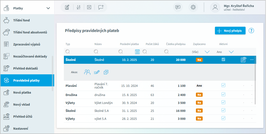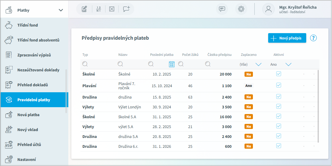 Přehled žáků předpisu - platby, splátkový kalendář ![]()