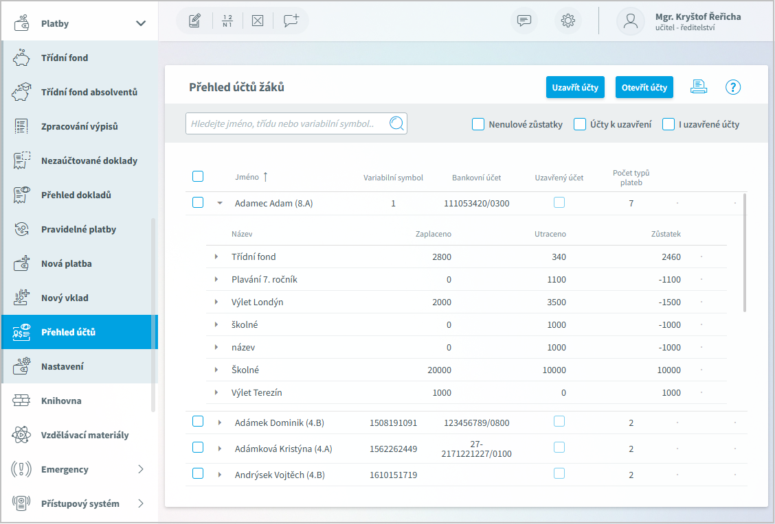 Požadovaný účet můžeme vyhledat dle jména, třídy, variabilního symbolu.