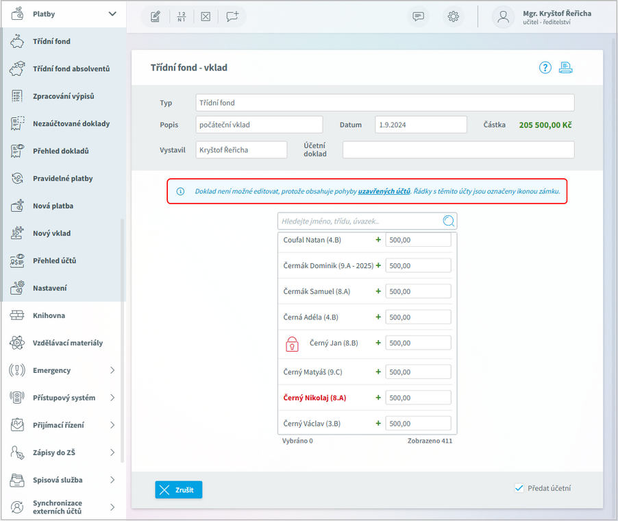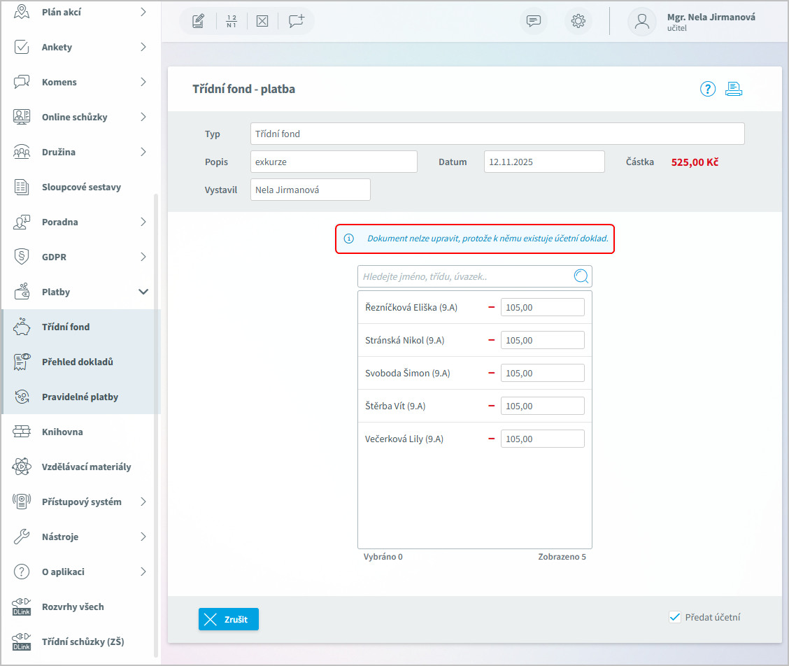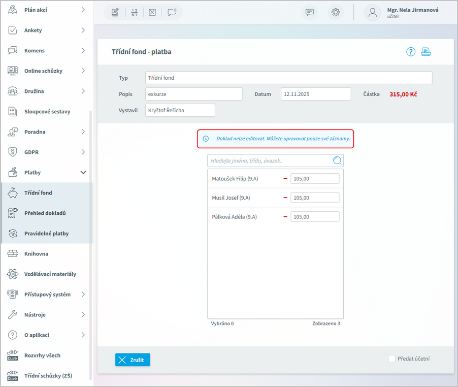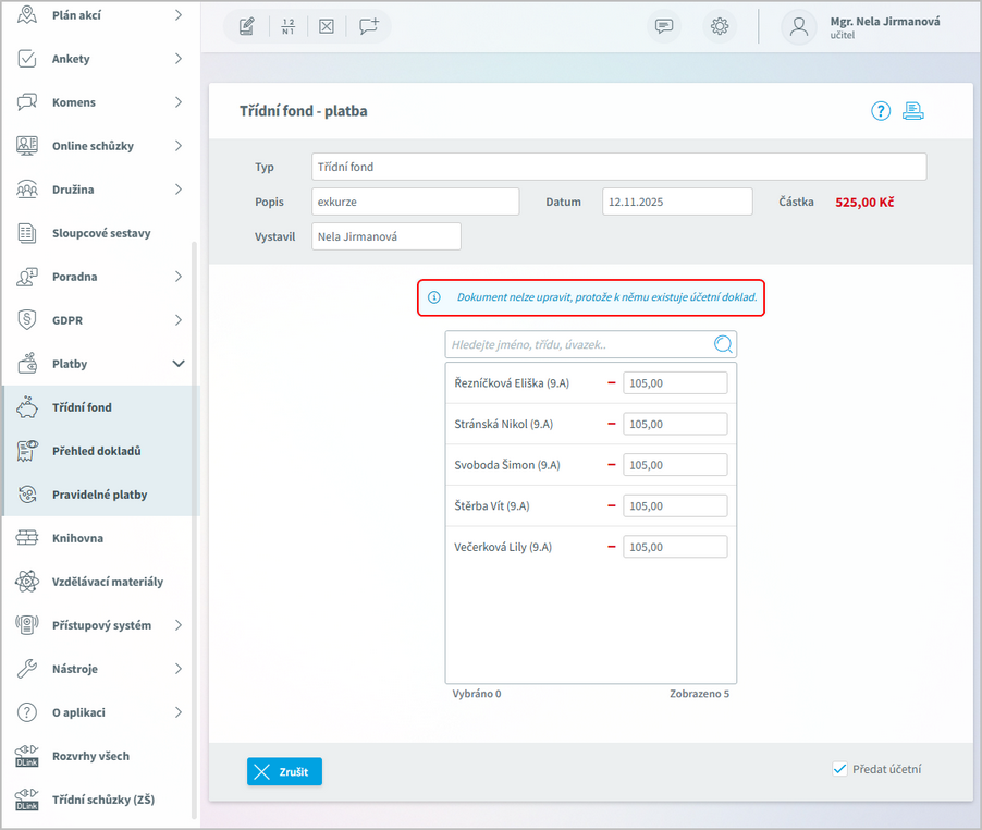 Učiteli, který je třídní pouze v jedné třídě, se po výběru Platby, Třídní fond rovnou zobrazí tyto podrobnosti.