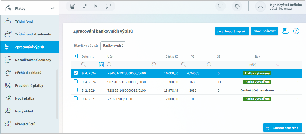 Pokud je dle čísla účtu a specifického symbolu nalezen typ platby a dle variabilního symbolu žák, automaticky se vytvoří platba, kterou můžeme pomocí