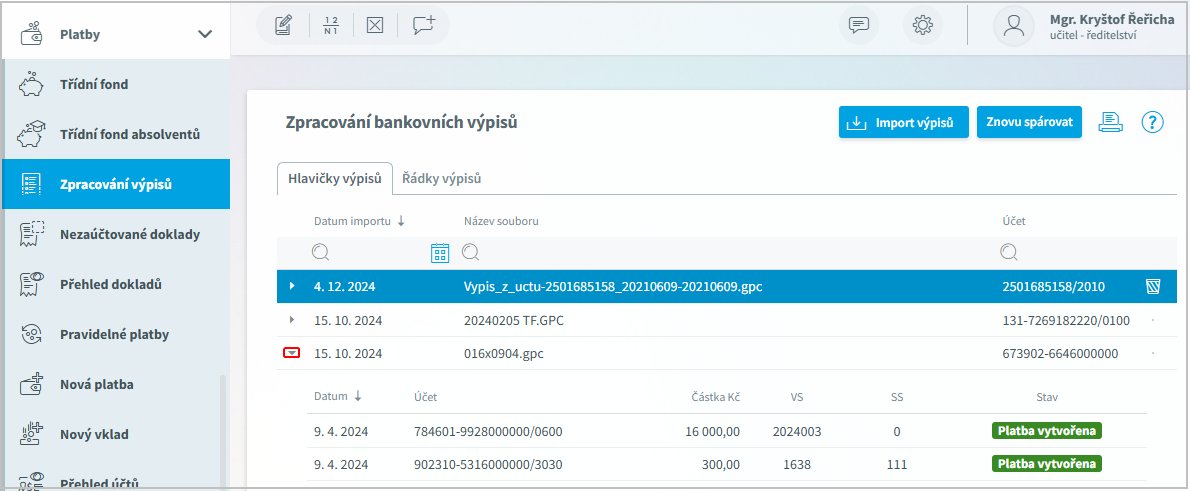 << Klikni pro zobrazení obsahu >> Navigace: Webová aplikace > Platby > Zpracování výpisů |